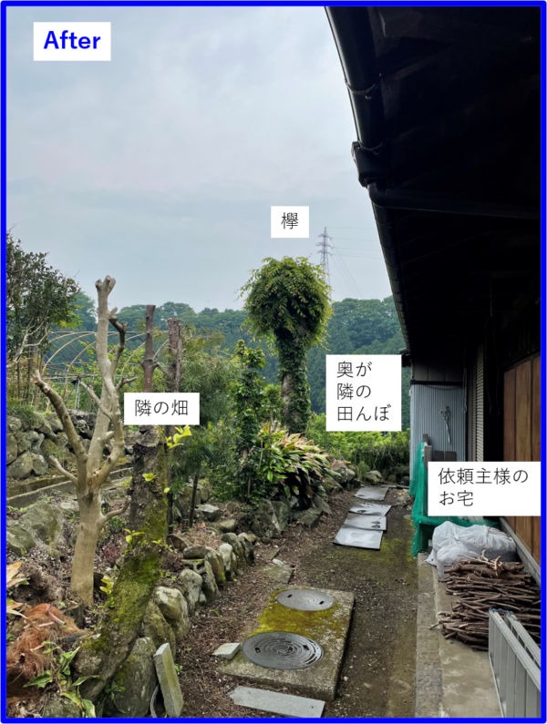 もちろん敷地境界からはみ出した枝は隣家や田んぼに落ちないように、また、家の屋根に掛かっていた枝は屋根に落ちないように切っていきました。
