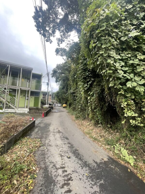 クレーンを使用して伐採する都合上、工事期間中一時通行止めにしなければならなかったのですが、この斜面に面した道路は行き止まりになっていて迂回路がないため、通行止め区間に面したアパート3棟、通行止め区間より奥にある建設会社の作業場が2か所、畑と農機具置場等々があり、アパートの管理会社や住民、土地の所有者、自治会長との調整を進め、ご承諾いただきました。