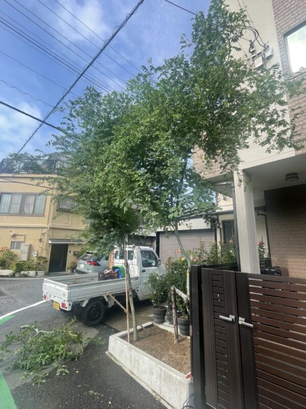 玄関の前のアカシア2本のうち1本を伐採、抜根、もう一本を剪定、支柱を設置してほしいとのご依頼でした。